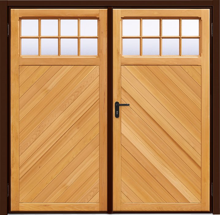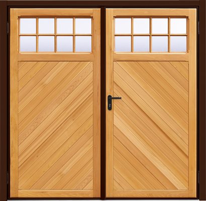 Garador's Ashton Chevron side hinged garage door is constructed from machined red cedar, for a beautiful natural look with reliable performance. These doors are fitted with a lever handle inside and out, providing users with easy access at all times. For added security, the option of an outside knob is available. This traditional door set up offers convenience and privacy over an up & over garage door where full width access is not generally required.
