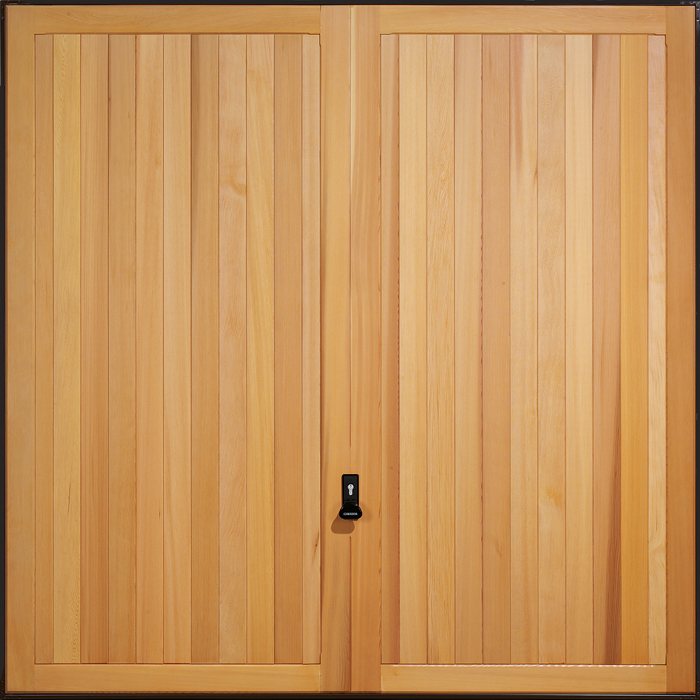 Constructed from solid red cedar, the Kingsbury is a classic timber Up and Over garage door. The Kingsbury offers a traditional tongued and grooved board design; with a wide board margin on each half of the door panel, giving the impression of side opening doors, whilst retaining all the benefits of an Up and Over garage door. The solid red cedar wood is very durable, and can be stained or painted without losing it's beautiful grained appearance. With initial and regular staining, the door will keep its stunning appearance and last a lifetime.